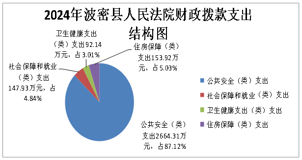 波密县人民法院2024年度财政拨款支出合计为3058.30万元,其中公共安全支出2664.31万元、社会保障和就业支出147.93万元、卫生健康支出92.14万元、住房保障支出153.92万元。