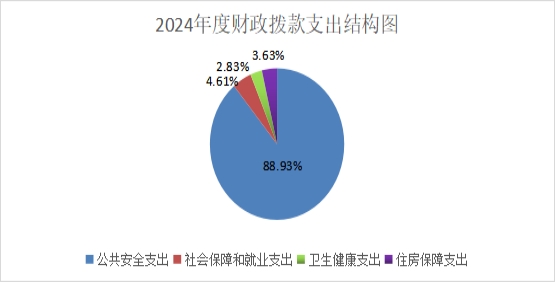2024年度财政拨款支出1507.36万元,主要用于以下方面:公共安全支出1340.50万元,占88.93%;社会保障和就业支出69.51万元,占4.61%;卫生健康支出42.66万元,占2.83%;住房保障支出54.69万元,占3.63%。